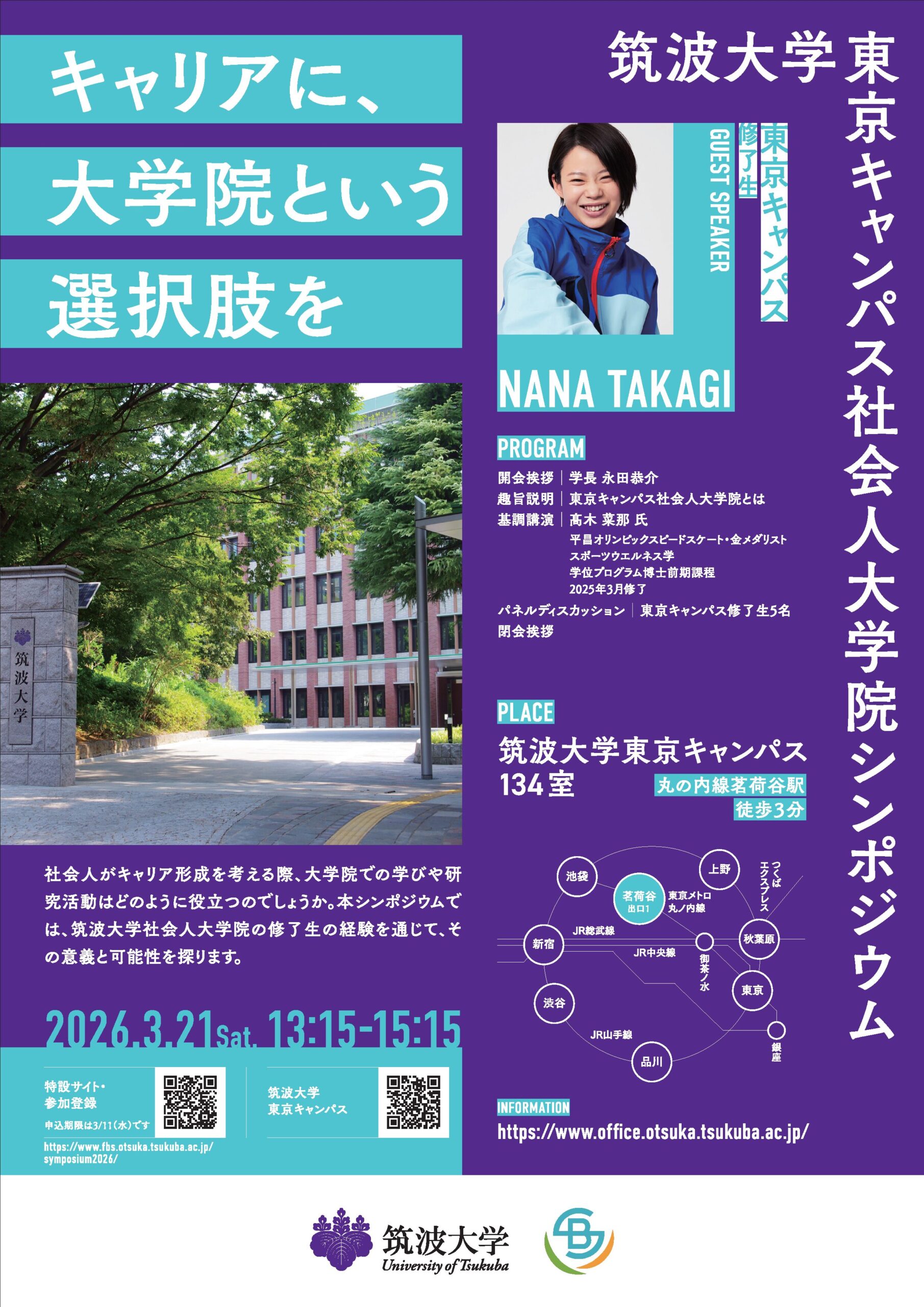 人口減少が続く日本において、大学には「知の総和」を高める役割が求められています。社会人大学院もその重要な要素の1つですが、日本社会では依然として社会人の学びの文化が十分に定着していません。社会人がキャリア形成を考える際、大学院での学びや研究活動はどのように役立つのでしょうか。本シンポジウムでは、筑波大学社会人大学院の修了生の経験を通じて、その意義と可能性を探ります。